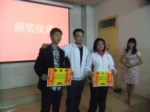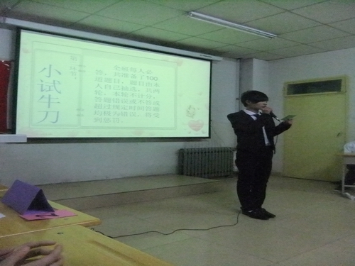 “心得分享”环节由各宿舍推荐一名同学进行学习经验交流,田娇娇等六名同学的发言使同学们受益匪浅。“小试牛刀”环节,准备了100到简答问题,是为了检测同学们的学习情况,每位同学都必须在规定时间内回答自己所选题目,同学们都积极参与、认真答题。“锋芒渐露”环节由班委抽选每组五名同学在给定的100道题中选题作答。“一决高下”环节将活动推向高潮,为了加强同学们的英语应用水平,各小组派出的三名同学分别朗读给定的英语文章,按照语速和流畅情况得分,同学们热情高涨,一决高下。最终,由5120和9204宿舍组成的“哆啦A梦”队获得了一等奖,颁发奖状以资鼓励。